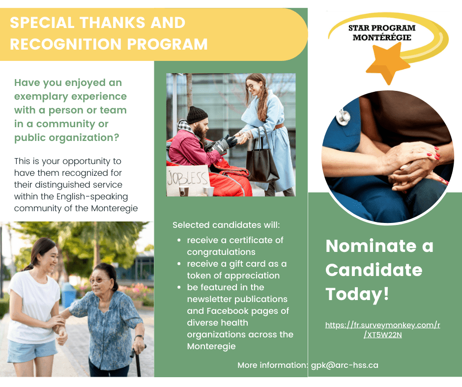 Do you know an employee, a volunteer or a team at a community or public organization who stands out for having made a special effort to improve the health and well-being of Montérégie’s English-speaking community members? We invite you to nominate them for the Special Thanks and Recognition Program (Star Program)!