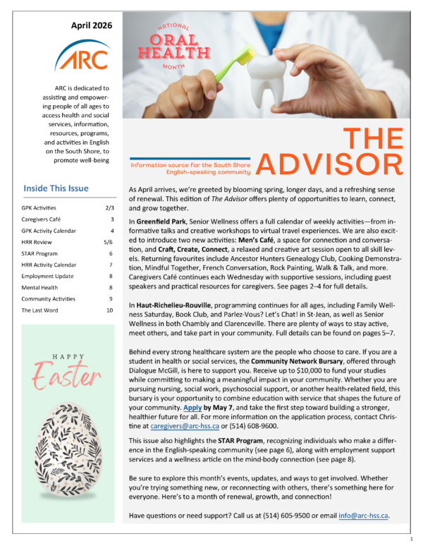 In Greenfield Park, Senior Wellness offers a full calendar of weekly activities—from informative talks and creative workshops to virtual travel experiences. We are also excited to introduce two new activities: Men’s Café, a space for connection and conversation, and Craft, Create, Connect, a relaxed and creative art session open to all skill levels. Returning favourites include Ancestor Hunters Genealogy Club, Cooking Demonstration, Mindful Together, French Conversation, Rock Painting, Walk & Talk, and more. Caregivers Café continues each Wednesday with supportive sessions, including guest speakers and practical resources for caregivers. See pages 2–4 for full details.
